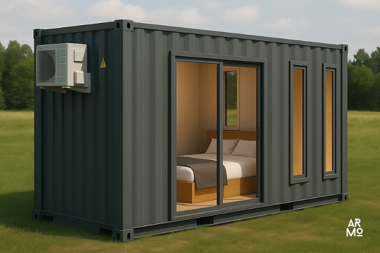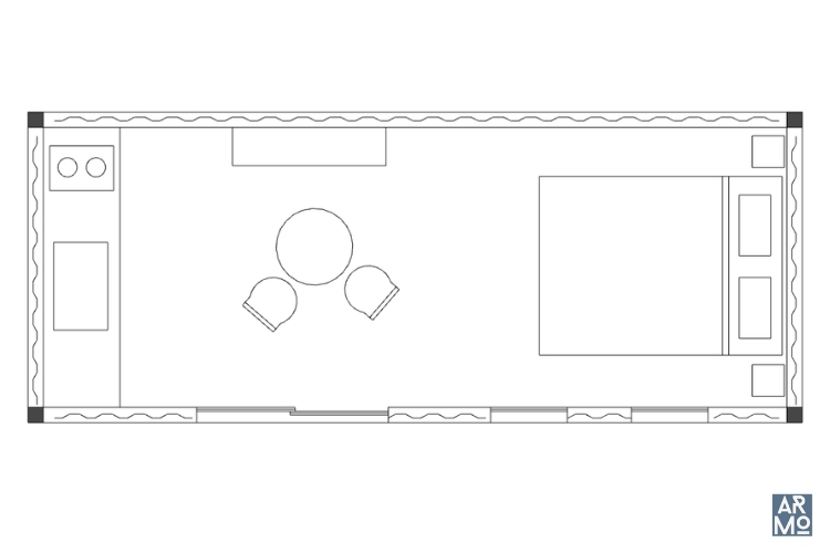 Módulo contenedor de vivienda tipo monoambiente, con acabados de primera y un sistema de climatización (AA) instalado. Ideal para proyectos de glamping o anexos residenciales. El espacio está diseñado para ofrecer funcionalidad y un alto confort. Atención: Esta unidad está configurada sin baño, permitiendo flexibilidad en la disposición de servicios externos o módulos sanitarios independientes.